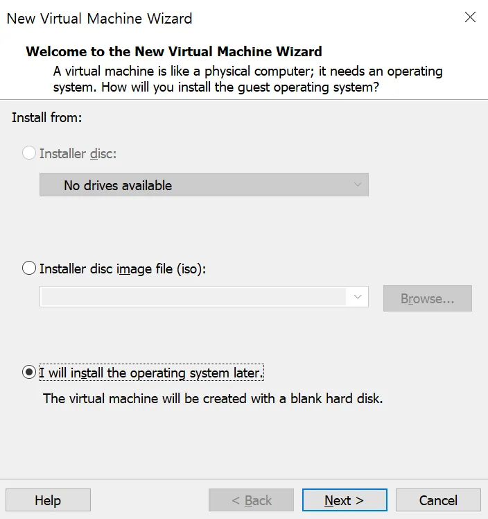 첫 화면에서 I will install the operating system later.를 선택하세요.