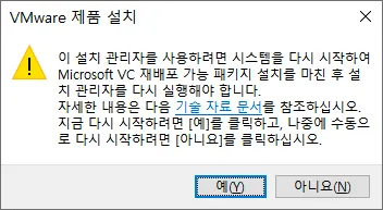 파일을 처음 실행하면 오른쪽과 같은 오류 메시지가 발생할 수도 있습니다. 예(Y)를 클릭하여 윈도우를 재시작한 다음 설치 파일 다시 실행하시면 정상 작동할 것 같습니다.