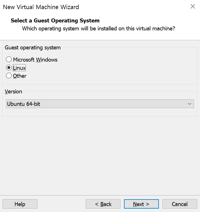 두 번째 화면에서는 LinuxUbuntu 64-bit을 선택하세요.
