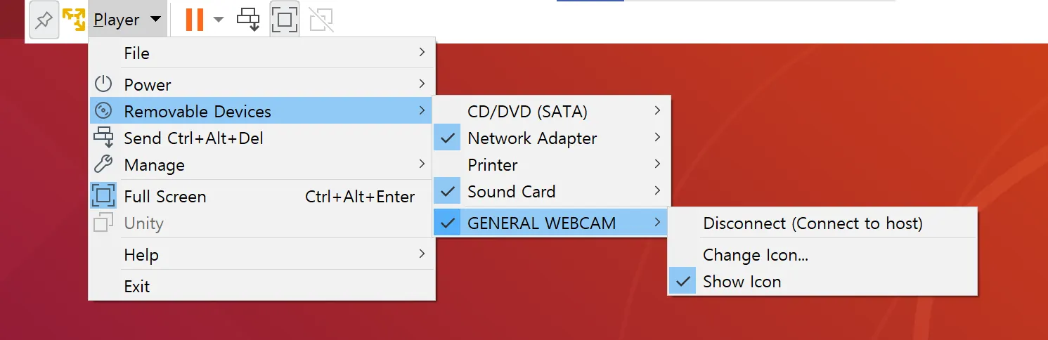먼저 cheese 등의 외부 프로그램을 통해 카메라가 VMware에 입력되는지 확인합니다.