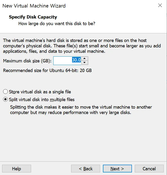 가상 머신 이름 입력하시고, 용량 세팅 진행해주세요. 저는 30GB로 했습니다!