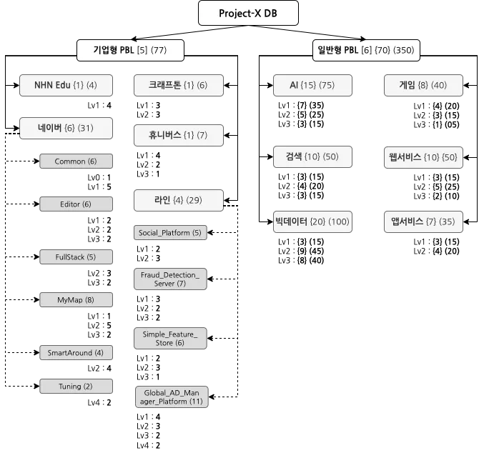 분야(AI, 검색, 빅데이터, 게임, 웹서비스, 앱서비스) → 레벨(1~3 Level) → 과정 → 문제(과정당 5개)