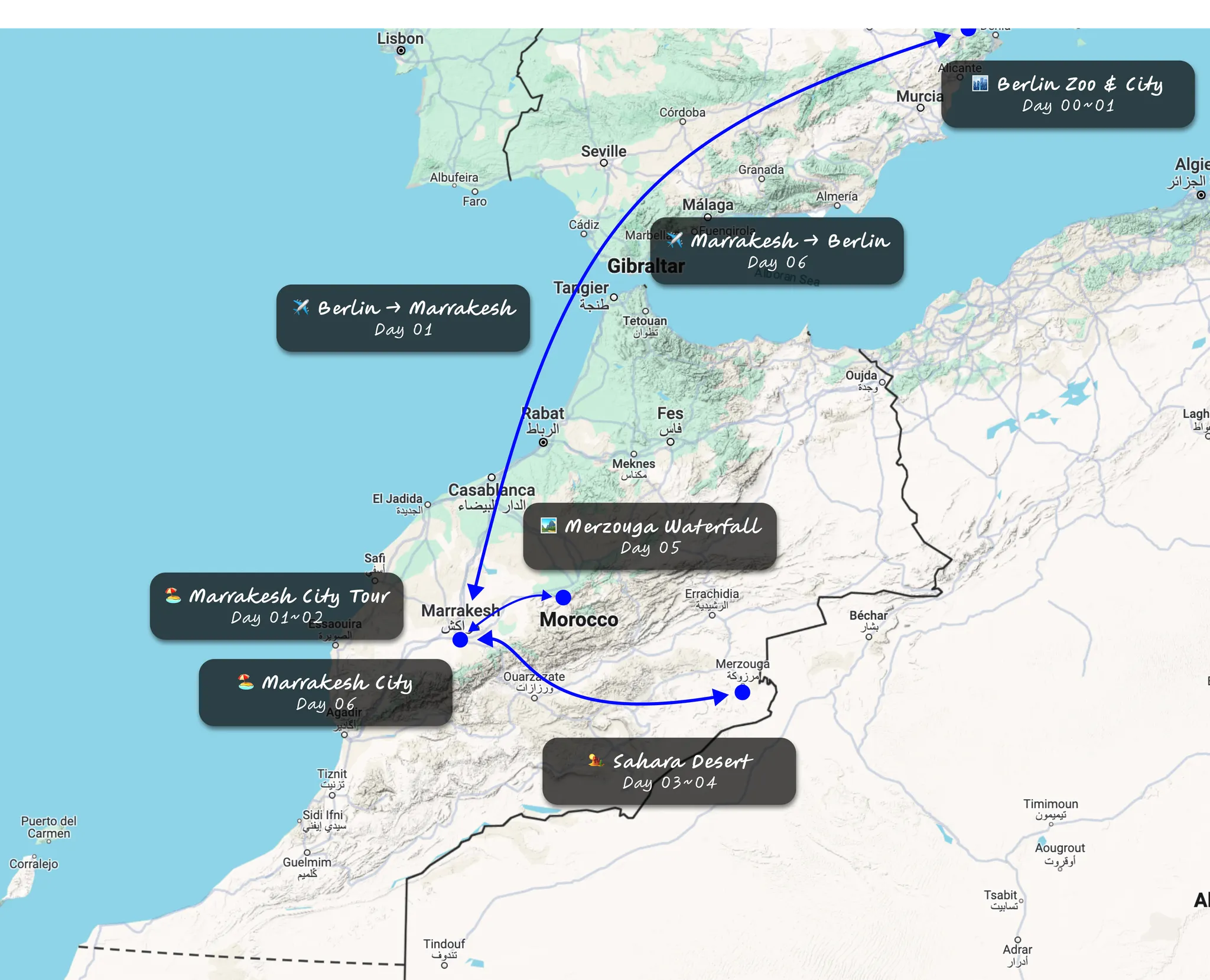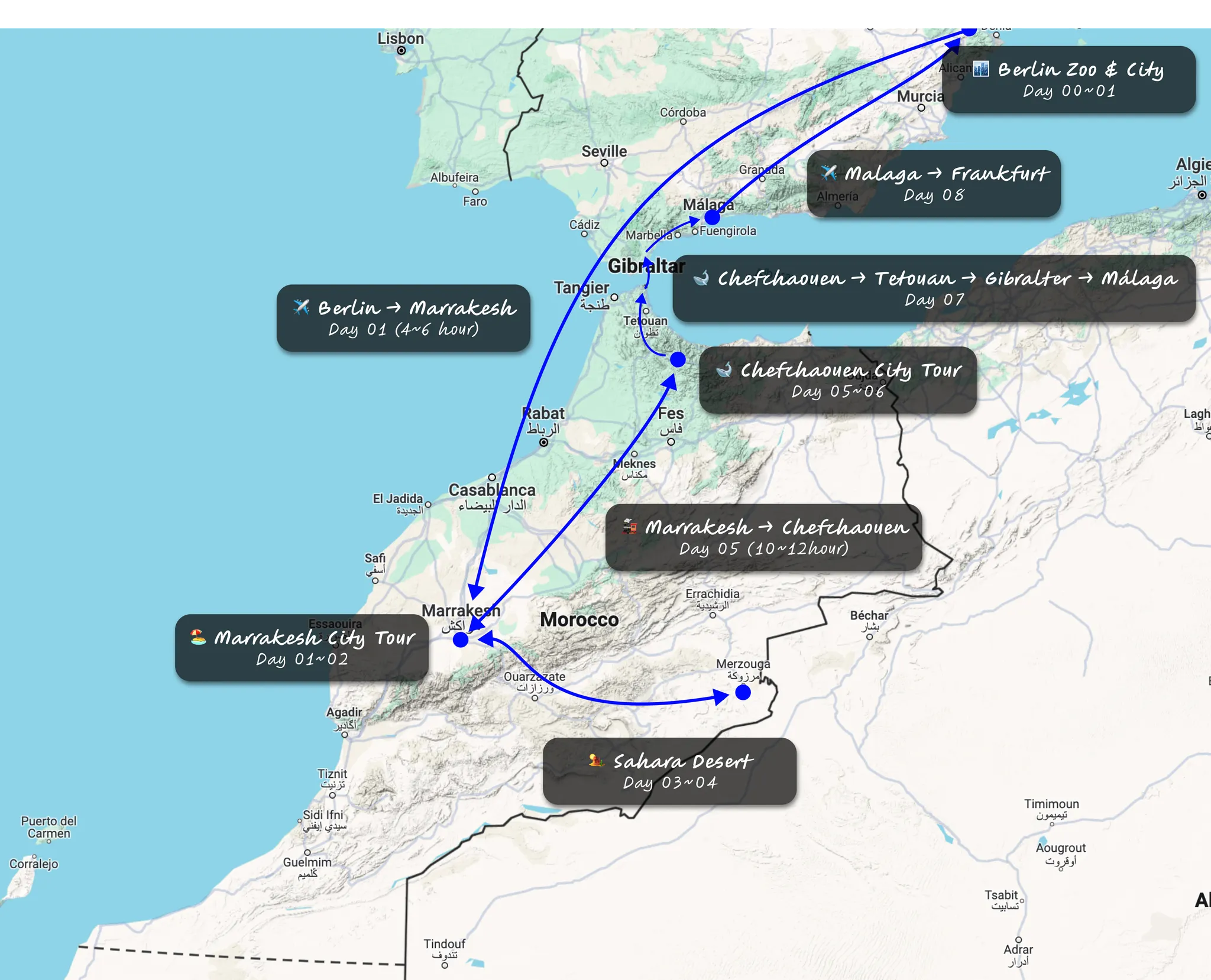 다른 멤버들의 계획은 사하라 사막 이후 Day 05의 새벽 비행기(4시 비행기)를 타고 베를린으로 돌아가는 거에요. (이 계획으로 몇명 꼬셔보려 했지만 너무 빡센 일정으로 인해 다들 거절 ㅋㅋ..) 사진에서 나타나듯 사하라 사막에서 돌아오는 8시간의 차량 이동을 끝낸 후 다음 날 아침 12시간 기차를 타고 바로 Chefchaouen(셰프샤우엔)으로 출발하고, 그날 저녁과 다음날을 관광한 뒤 Day 07에 버스를 타고 Tetouan(테토안), 여기서 택시를 타고 Ceuta(세우타), Ferry를 타고 Gibralter(지브롤터), 마지막으로 버스를 다시 타고 Málaga(말라가)…. 여기서 하루 숙박 후 비행기를 타고 프랑크푸르트로 돌아오는 옵션이었어요.